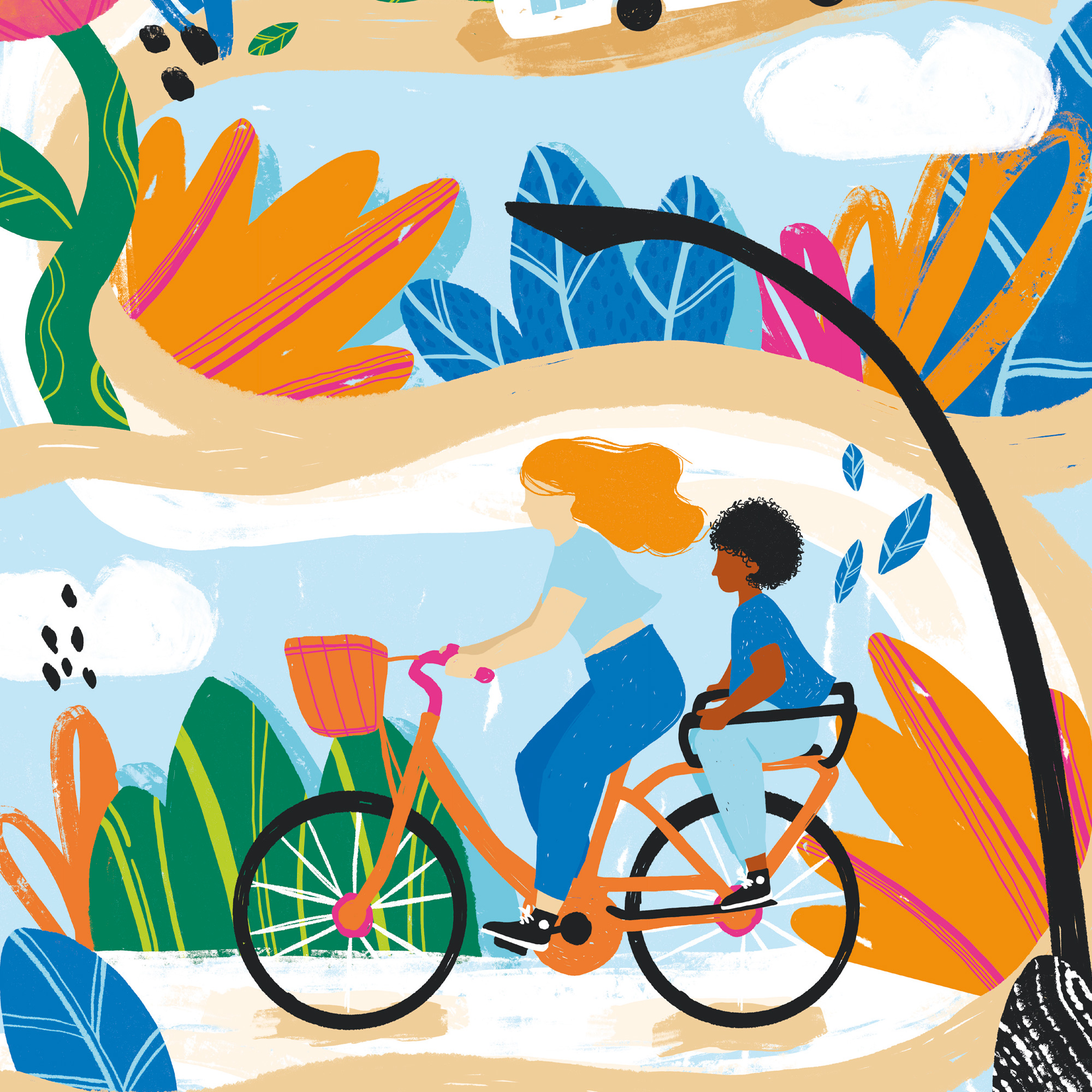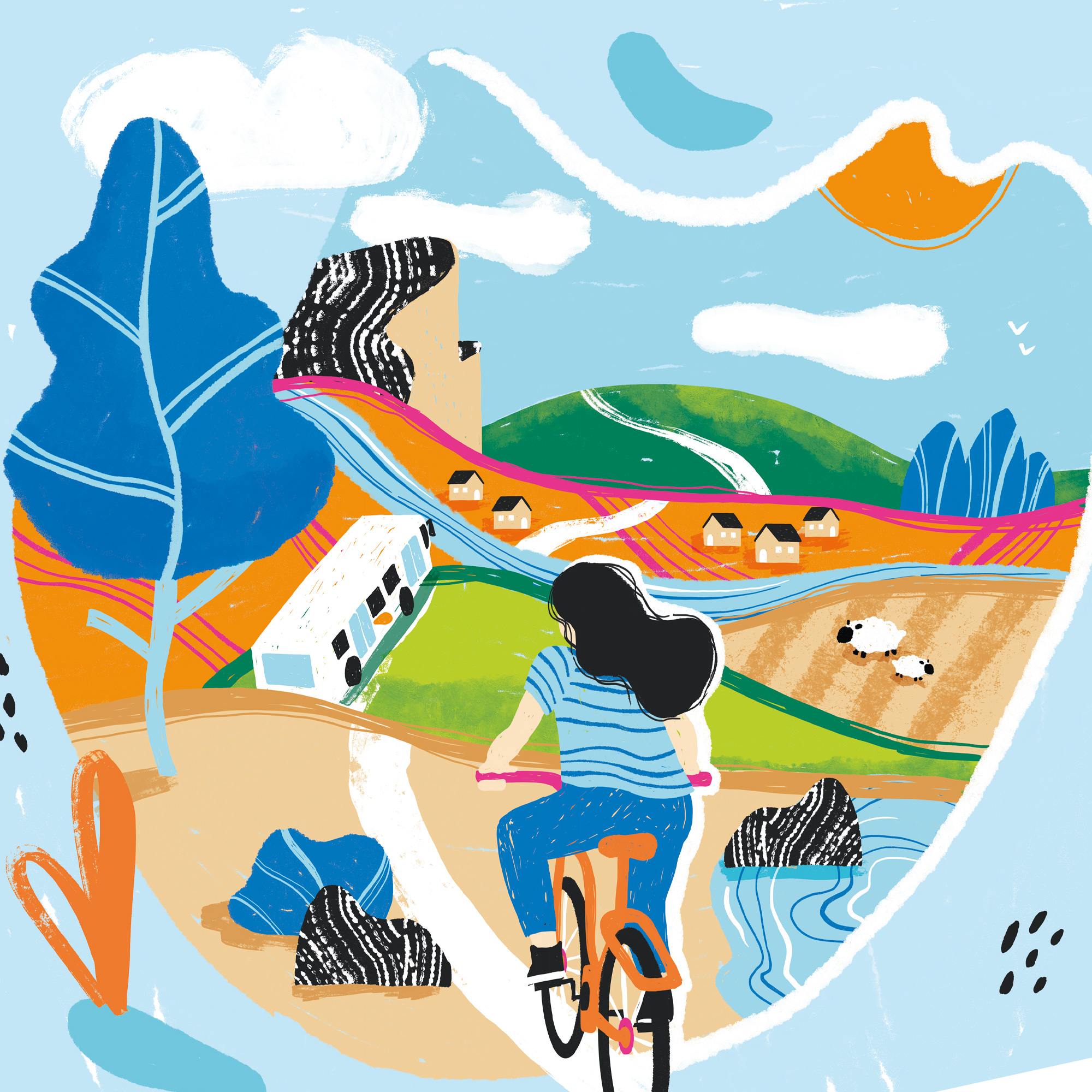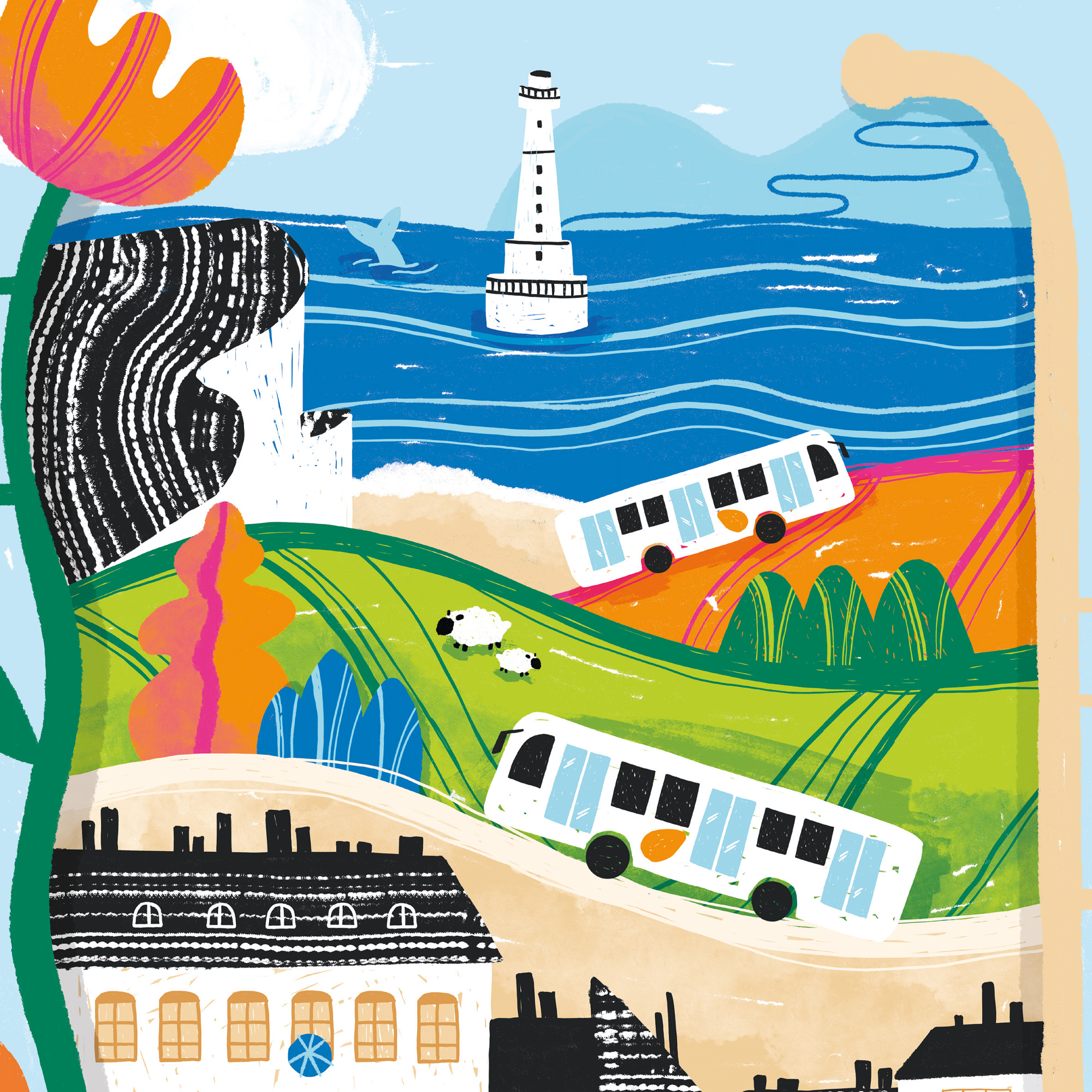 Un univers graphique fort : le style illustratif joue avec des formes stylisées, des lignes fluides, des éléments végétaux et des bâtiments aux couleurs contrastées. L’ensemble compose une ambiance à la fois ludique, artistique et chaleureuse, qui rend le territoire vivant et accueillant. Ce mélange de réel et d’abstrait stimule l’imaginaire tout en restant accessible.