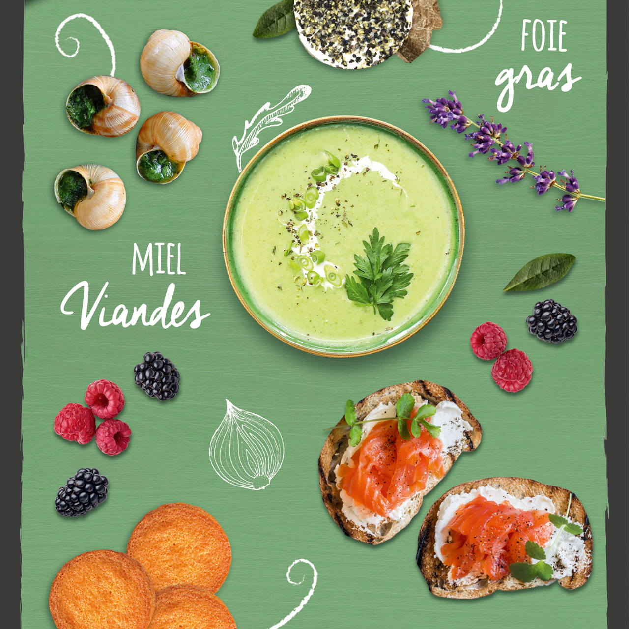 Création graphique et mise en page des guides des « Produits du terroir des agriculteurs & des artisans de la Manche », édité par le label Manche Terroirs, depuis 2018. La couverture est composée d’un mélange de photos, d’illustrations, et de jeux typographiques des produits regroupés dans ce guide et de différentes textures telles que le kraft, l’ardoise… créant ainsi un visuel moderne et authentique.